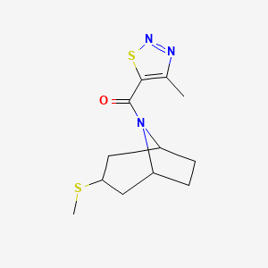 The compound (4-methyl-1,2,3-thiadiazol-5-yl)((1R,5S)-3-(methylthio)-8-azabicyclo[3.2.1]octan-8-yl)methanone represents a unique class of heterocyclic compounds that exhibit notable biological activities. Its structure combines a thiadiazole moiety with a bicyclic amine framework, which has been linked to various pharmacological effects, including antimicrobial and anti-inflammatory properties.