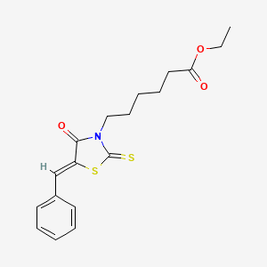(Z)-ethyl 6-(5-benzylidene-4-oxo-2-thioxothiazolidin-3-yl)hexanoate is a complex organic compound that belongs to the class of thiazolidinones. These compounds are known for their diverse biological activities and have been extensively studied for their potential therapeutic applications. The unique structure of this compound, featuring a thioxothiazolidinone core with a benzylidene substituent, makes it an interesting subject for chemical and pharmacological research.