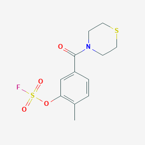 The mechanism of action of 4-(3-Fluorosulfonyloxy-4-methylbenzoyl)thiomorpholine involves its interaction with specific molecular targets. The fluorosulfonyloxy group can participate in various chemical reactions, influencing the compound’s reactivity and interactions with other molecules. The thiomorpholine ring may also play a role in modulating the compound’s biological activity by interacting with enzymes or receptors .