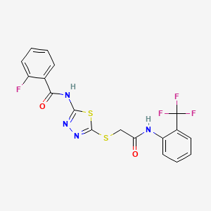 2-fluoro-N-(5-((2-oxo-2-((2-(trifluoromethyl)phenyl)amino)ethyl)thio)-1,3,4-thiadiazol-2-yl)benzamide is unique due to its combination of a fluorine atom, a trifluoromethyl group, and a thiadiazole ring. This combination imparts distinct chemical and biological properties, making it a valuable compound for various applications.