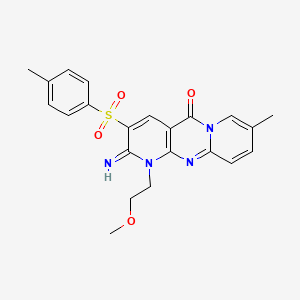 The synthesis of 2-imino-1-(2-methoxyethyl)-8-methyl-3-tosyl-1H-dipyrido[1,2-a:2’,3’-d]pyrimidin-5(2H)-one involves multiple steps, starting from readily available starting materials. The key steps typically include the formation of the dipyrido[1,2-a:2’,3’-d]pyrimidine core, followed by functionalization at various positions to introduce the imino, methoxyethyl, methyl, and tosyl groups. Common reagents used in these steps include strong bases, oxidizing agents, and protecting groups to ensure selective reactions .