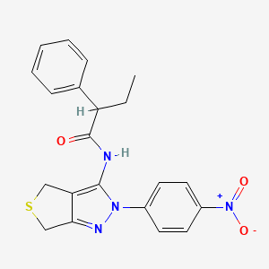 N-[2-(4-nitrophenyl)-2H,4H,6H-thieno[3,4-c]pyrazol-3-yl]-2-phenylbutanamide is a complex organic compound that belongs to the class of thienopyrazoles This compound is characterized by the presence of a thieno[3,4-c]pyrazole core, which is a fused heterocyclic system containing both sulfur and nitrogen atoms