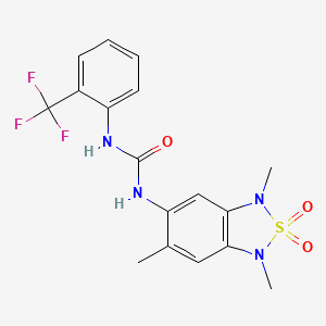 1-(2-(Trifluoromethyl)phenyl)-3-(1,3,6-trimethyl-2,2-dioxido-1,3-dihydrobenzo[c][1,2,5]thiadiazol-5-yl)urea is a urea-based small molecule characterized by a trifluoromethylphenyl group and a substituted benzo[c][1,2,5]thiadiazole ring system. The urea moiety (-NHCONH-) serves as a central linker, connecting the aromatic and heterocyclic components. The benzo[c][1,2,5]thiadiazole core is modified with methyl groups at positions 1, 3, and 6, as well as a sulfone group (dioxido) at position 2.