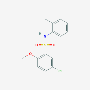 The mechanism of action of 5-chloro-N-(2-ethyl-6-methylphenyl)-2-methoxy-4-methylbenzene-1-sulfonamide involves its interaction with molecular targets such as enzymes or receptors. The sulfonamide group can form hydrogen bonds with active sites, while the methoxy and chloro groups may enhance binding affinity through hydrophobic interactions. These interactions can modulate the activity of the target molecules, leading to various biological effects.