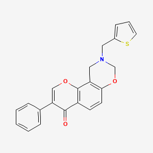 The synthesis of 3-phenyl-9-(thiophen-2-ylmethyl)-9,10-dihydrochromeno[8,7-e][1,3]oxazin-4(8H)-one typically involves multiple steps, starting with the construction of the chromeno[8,7-e][1,3]oxazine core One common approach is to start with a suitable phenyl-substituted precursor, which undergoes cyclization reactions under acidic or basic conditions to form the oxazine ring