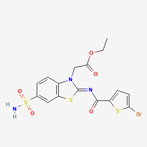 Ethyl 2-[(2Z)-2-[(5-bromothiophene-2-carbonyl)imino]-6-sulfamoyl-2,3-dihydro-1,3-benzothiazol-3-yl]acetate is a complex organic compound with potential biological activity due to its unique structural features. This compound contains a benzothiazole ring, a thiophene moiety, and a sulfonamide group, which are known for their diverse pharmacological properties.