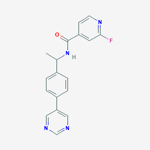 2-fluoro-N-{1-[4-(pyrimidin-5-yl)phenyl]ethyl}pyridine-4-carboxamide is a synthetic organic compound that features a pyridine ring substituted with a fluoro group and a carboxamide group, along with a phenyl ring substituted with a pyrimidine moiety