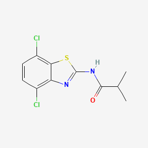N-(4,7-Dichloro-1,3-benzothiazol-2-yl)-2-methylpropanamide is a benzothiazole derivative characterized by a 4,7-dichloro-substituted benzothiazole core linked to a branched 2-methylpropanamide group. Benzothiazoles are heterocyclic compounds with a sulfur and nitrogen atom in their aromatic ring, often associated with diverse biological activities, including antimicrobial, anticancer, and anti-inflammatory properties . The 2-methylpropanamide substituent introduces steric bulk, which may influence conformational flexibility and intermolecular interactions.