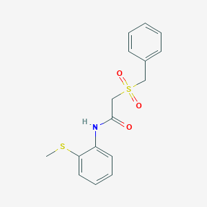 The mechanism of action of 2-(benzylsulfonyl)-N-(2-(methylthio)phenyl)acetamide involves its interaction with specific molecular targets. For instance, its inhibition of cyclooxygenase enzymes is due to its ability to bind to the active site of the enzyme, preventing the conversion of arachidonic acid to prostaglandins, which are mediators of inflammation .