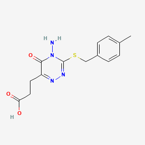 The synthesis of 3-(4-amino-3-{[(4-methylphenyl)methyl]sulfanyl}-5-oxo-4,5-dihydro-1,2,4-triazin-6-yl)propanoic acid typically involves multiple steps. One common method involves the reaction of 4-methylbenzyl chloride with thiourea to form 4-methylphenylmethylthiourea. This intermediate is then reacted with hydrazine hydrate to form 4-amino-3-{[(4-methylphenyl)methyl]sulfanyl}-1,2,4-triazine. Finally, the triazine derivative is reacted with acrylonitrile followed by hydrolysis to yield the target compound.
