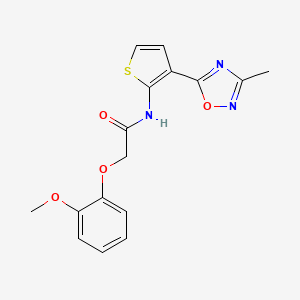 2-(2-Methoxyphenoxy)-N-(3-(3-methyl-1,2,4-oxadiazol-5-yl)thiophen-2-yl)acetamide (molecular formula: C₁₉H₁₉N₃O₄, molecular weight: 353.37 g/mol) is a heterocyclic acetamide derivative featuring a thiophene core substituted with a 3-methyl-1,2,4-oxadiazole moiety and an acetamide side chain linked to a 2-methoxyphenoxy group . This compound combines aromatic (thiophene, methoxyphenoxy) and heterocyclic (1,2,4-oxadiazole) components, which are commonly associated with enhanced bioactivity and metabolic stability in medicinal chemistry.