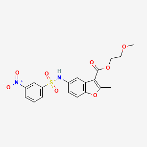 The mechanism of action of 2-METHOXYETHYL 2-METHYL-5-(3-NITROBENZENESULFONAMIDO)-1-BENZOFURAN-3-CARBOXYLATE involves its interaction with specific molecular targets and pathways. The nitrobenzenesulfonamido group may interact with enzymes or receptors, leading to inhibition or activation of specific biological processes. The benzofuran ring system may also contribute to the compound’s overall activity by stabilizing the interaction with the target molecules.