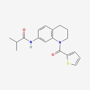 The synthesis of 2-methyl-N-[1-(thiophene-2-carbonyl)-1,2,3,4-tetrahydroquinolin-7-yl]propanamide can be achieved through several synthetic routes. One common method involves the condensation of thiophene-2-carboxylic acid with 1,2,3,4-tetrahydroquinoline under acidic conditions to form the intermediate 1-(thiophene-2-carbonyl)-1,2,3,4-tetrahydroquinoline. This intermediate is then reacted with 2-methylpropanoyl chloride in the presence of a base such as triethylamine to yield the final product.