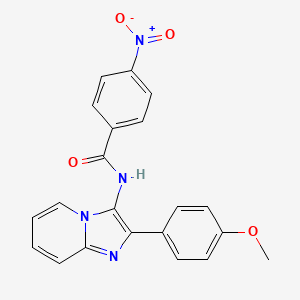The synthesis of N-[2-(4-methoxyphenyl)imidazo[1,2-a]pyridin-3-yl]-4-nitrobenzamide typically involves multi-step reactions. One common method includes the condensation of 2-aminopyridines with arylglyoxals and Meldrum’s acid . This multicomponent reaction is efficient and yields the desired imidazo[1,2-a]pyridine derivatives. Industrial production methods may involve similar synthetic routes but are optimized for large-scale production, ensuring high yield and purity of the final product.