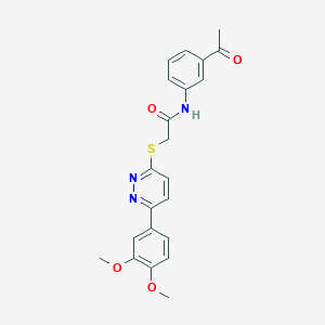 N-(3-acetylphenyl)-2-((6-(3,4-dimethoxyphenyl)pyridazin-3-yl)thio)acetamide is a synthetic acetamide derivative featuring a pyridazine core substituted with a 3,4-dimethoxyphenyl group and a thioether-linked acetylphenyl moiety. The compound’s design incorporates key pharmacophoric elements such as aromatic substituents, hydrogen-bond acceptors (methoxy groups), and lipophilic regions, which are critical for target binding and bioavailability .