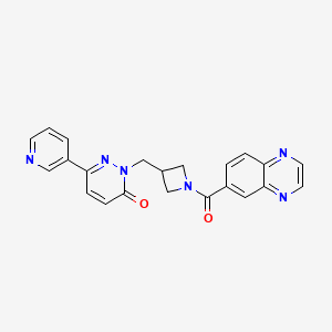 This compound features a pyridin-3-yl group at the 6-position of a dihydropyridazin-3-one core, further substituted by a quinoxaline-6-carbonyl-linked azetidin-3-ylmethyl moiety. The azetidine ring may enhance metabolic stability compared to bulkier heterocycles like piperidine or pyrrolidine .