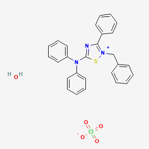 The mechanism of action of 2-Benzyl-5-(diphenylamino)-3-phenyl-1,2,4-thiadiazol-2-ium perchlorate hydrate involves its interaction with specific molecular targets and pathways. The compound can interact with enzymes, receptors, or other biomolecules, leading to changes in their activity or function. These interactions can result in various biological effects, such as inhibition of enzyme activity, modulation of receptor signaling, or disruption of cellular processes.