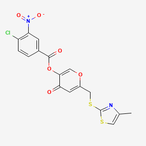 This compound is a hybrid molecule featuring a pyran-thiazole core and a substituted benzoate ester. The pyran ring (4-oxo-4H-pyran-3-yl) is linked via a thioether bridge to a 4-methylthiazole group, while the ester moiety is derived from 4-chloro-3-nitrobenzoic acid. Its design combines electron-withdrawing substituents (chloro, nitro) on the benzoate, which may enhance stability and influence binding interactions.