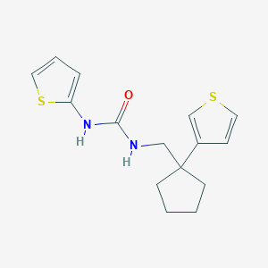 The synthesis of 1-(Thiophen-2-yl)-3-((1-(thiophen-3-yl)cyclopentyl)methyl)urea typically involves the reaction of thiophene derivatives with urea or its analogs. One common method is the reaction of 2-thiophenyl isocyanate with 1-(thiophen-3-yl)cyclopentylamine under controlled conditions. The reaction is usually carried out in an inert atmosphere, such as nitrogen or argon, to prevent oxidation and other side reactions. Solvents like dichloromethane or tetrahydrofuran are often used to dissolve the reactants and facilitate the reaction.