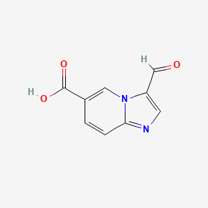 The synthesis of 3-Formylimidazo[1,2-A]pyridine-6-carboxylic acid can be achieved through various synthetic routes. One common method involves the condensation of 2-aminopyridine with glyoxal in the presence of an acid catalyst, followed by oxidation to introduce the formyl group at the 3-position. Another approach involves the cyclization of 2-aminopyridine derivatives with appropriate aldehydes under acidic conditions .
