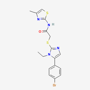 The compound 2-((5-(4-bromophenyl)-1-ethyl-1H-imidazol-2-yl)thio)-N-(4-methylthiazol-2-yl)acetamide is a complex organic molecule characterized by its unique structural features, including imidazole and thiazole rings. These components are often associated with significant biological activities, particularly in the fields of antimicrobial and anticancer research. This article explores the biological activity of this compound, synthesizing findings from various studies and presenting data in a structured format.