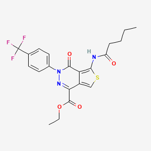 Ethyl 4-oxo-5-pentanamido-3-[4-(trifluoromethyl)phenyl]-3H,4H-thieno[3,4-d]pyridazine-1-carboxylate is a complex organic compound that belongs to the class of thienopyridazines. This compound is characterized by its unique structure, which includes a thieno[3,4-d]pyridazine core, a trifluoromethyl phenyl group, and an ethyl ester functional group. The presence of these functional groups imparts distinct chemical and physical properties to the compound, making it of interest in various scientific research fields.