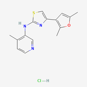 The synthesis of 4-(2,5-dimethylfuran-3-yl)-N-(4-methylpyridin-3-yl)thiazol-2-amine hydrochloride typically involves the condensation of 2,5-dimethylfuran with thioamide under acidic conditions, leading to the formation of the thiazole ring. The hydrochloride salt is produced by treating the thiazole derivative with hydrochloric acid. The molecular formula is C16H19N3OS·HCl, with a molecular weight of approximately 321.82 g/mol .