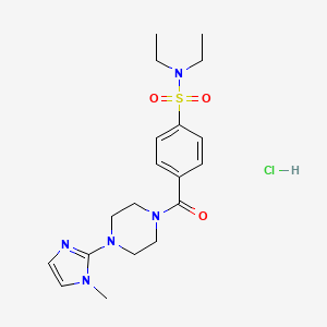 The synthesis of N,N-diethyl-4-(4-(1-methyl-1H-imidazol-2-yl)piperazine-1-carbonyl)benzenesulfonamide hydrochloride typically involves multiple steps, starting with the preparation of the imidazole ring. Common methods for synthesizing imidazoles include the Debus-Radziszewski synthesis, Wallach synthesis, and the dehydrogenation of imidazolines . The piperazine ring can be synthesized through cyclization reactions involving diethylenetriamine and appropriate reagents . The final step involves the sulfonation of the benzene ring and subsequent coupling with the imidazole and piperazine intermediates under controlled conditions .