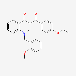 3-(4-ethoxybenzoyl)-1-[(2-methoxyphenyl)methyl]-1,4-dihydroquinolin-4-one is a synthetic compound belonging to the quinolone class. This compound is notable for its diverse biological activities, including potential antibacterial, antiviral, and anticancer properties. The unique structure of this compound, featuring an ethoxybenzoyl group and a methoxyphenylmethyl moiety, positions it as a candidate for various pharmacological applications.