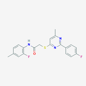 N-(2-fluoro-4-methylphenyl)-2-((2-(4-fluorophenyl)-6-methylpyrimidin-4-yl)thio)acetamide is a pyrimidine-based acetamide derivative featuring a thioether linkage and fluorinated aryl substituents. The compound’s structure includes a 6-methylpyrimidine core substituted at the 2-position with a 4-fluorophenyl group and at the 4-position with a thioacetamide moiety bearing a 2-fluoro-4-methylphenyl group.