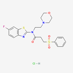 The synthesis of 3-(BENZENESULFONYL)-N-(6-FLUORO-1,3-BENZOTHIAZOL-2-YL)-N-[2-(MORPHOLIN-4-YL)ETHYL]PROPANAMIDE HYDROCHLORIDE typically involves multi-step organic reactions. The process begins with the preparation of the benzothiazole core, followed by the introduction of the fluorine atom at the 6-position. The benzenesulfonyl group is then attached through sulfonation reactions. Finally, the morpholinyl group is introduced via nucleophilic substitution reactions .