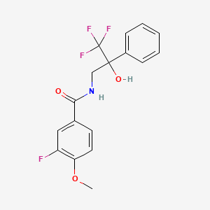 Amide Formation: The key step involves the formation of the amide bond. This can be achieved by activating the carboxylic acid group of 3-fluoro-4-methoxybenzoic acid using a coupling reagent like N,N’-dicyclohexylcarbodiimide (DCC) in the presence of a catalyst such as 4-dimethylaminopyridine (DMAP). The activated acid is then reacted with 3,3,3-trifluoro-2-hydroxy-2-phenylpropylamine to form the desired amide.