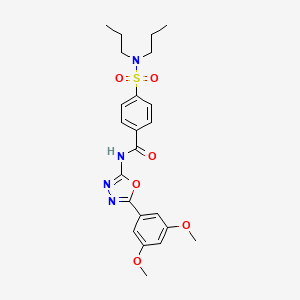 The synthesis of N-[5-(3,5-dimethoxyphenyl)-1,3,4-oxadiazol-2-yl]-4-(dipropylsulfamoyl)benzamide involves multiple steps. One common synthetic route includes the formation of the oxadiazole ring through cyclization reactions involving hydrazides and carboxylic acids . The reaction conditions typically require the use of dehydrating agents and catalysts to facilitate the cyclization process. Industrial production methods may involve optimizing these reaction conditions to achieve higher yields and purity .