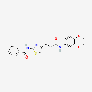 InChI=1S/C21H19N3O4S/c25-19(22-15-6-8-17-18(12-15)28-11-10-27-17)9-7-16-13-29-21(23-16)24-20(26)14-4-2-1-3-5-14/h1-6,8,12-13H,7,9-11H2,(H,22,25)(H,23,24,26) | |
