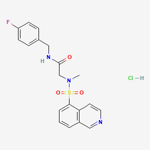 N-(4-Fluorobenzyl)-2-(N-methylisoquinoline-5-sulfonamido)acetamide hydrochloride is a synthetic small molecule characterized by a 4-fluorobenzyl group, an isoquinoline-5-sulfonamido moiety, and an acetamide backbone. The hydrochloride salt enhances its solubility and stability, making it suitable for pharmacological studies. The compound’s structure combines aromatic (isoquinoline) and sulfonamide functionalities, which are common in bioactive molecules targeting enzymes or receptors. Suppliers globally offer this compound (e.g., GrowingChem, Novasep), indicating its relevance in research .