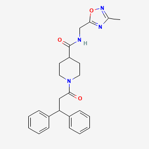 The mechanism of action of 1-(3,3-diphenylpropanoyl)-N-[(3-methyl-1,2,4-oxadiazol-5-yl)methyl]piperidine-4-carboxamide depends on its specific application. In medicinal chemistry, it may interact with molecular targets such as enzymes or receptors, altering their activity through binding interactions. The oxadiazole ring can participate in hydrogen bonding and π-π interactions, while the piperidine ring can provide structural rigidity and influence the compound’s pharmacokinetics.