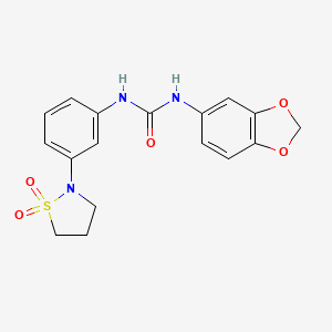 The systematic name of this compound is derived from its two primary substituents attached to the urea core. The benzo[d]dioxol-5-yl group is a bicyclic aromatic system comprising a benzene ring fused with a methylenedioxy bridge at positions 1 and 3. The second substituent, 3-(1,1-dioxidoisothiazolidin-2-yl)phenyl, consists of a phenyl ring substituted at the 3-position with an isothiazolidine-1,1-dioxide moiety. Following IUPAC rules, the full name is 1-(Benzo[d]dioxol-5-yl)-3-[3-(1,1-dioxidoisothiazolidin-2-yl)phenyl]urea .