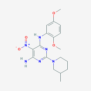 N4-(2,5-Dimethoxyphenyl)-2-(3-methylpiperidin-1-yl)-5-nitropyrimidine-4,6-diamine (CAS: 714255-71-7) is a pyrimidine derivative with a molecular formula of C₁₈H₂₄N₆O₄ and a molecular weight of 388.4 g/mol . The compound features a central 5-nitropyrimidine core substituted at the N4 position with a 2,5-dimethoxyphenyl group and at the C2 position with a 3-methylpiperidin-1-yl moiety.