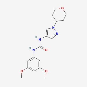 The chemical structure of 1-(3,5-dimethoxyphenyl)-3-[1-(oxan-4-yl)-1H-pyrazol-4-yl]urea features a urea moiety linked to a pyrazole ring and an oxane group. This unique combination of functional groups contributes to its biological activity and solubility characteristics.