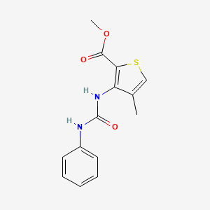 The mechanism of action of Methyl 3-[(anilinocarbonyl)amino]-4-methyl-2-thiophenecarboxylate involves its interaction with specific molecular targets. The aniline group can interact with enzymes or receptors, potentially inhibiting their activity. The thiophene ring may also play a role in modulating the compound’s biological activity by interacting with cellular membranes or proteins .