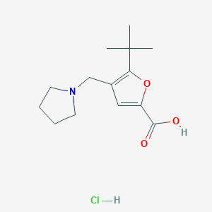 The mechanism of action of 5-Tert-butyl-4-pyrrolidin-1-ylmethyl-furan-2-carboxylic acid hydrochloride would depend on its specific application. In medicinal chemistry, it might interact with biological targets such as enzymes or receptors, modulating their activity. The furan ring and pyrrolidine moiety could facilitate binding to specific sites, while the carboxylic acid group might participate in hydrogen bonding or ionic interactions.
