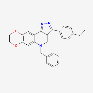 5-benzyl-3-(4-ethylphenyl)-8,9-dihydro-5H-[1,4]dioxino[2,3-g]pyrazolo[4,3-c]quinoline is a synthetic compound belonging to the class of pyrazoloquinolines. This compound has garnered attention for its potential biological activities, particularly in the fields of oncology and pharmacology. The structural features of this compound suggest possible interactions with various biological targets, leading to significant therapeutic implications.