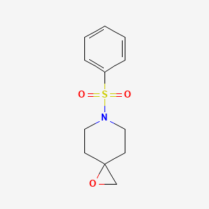 6-(Benzenesulfonyl)-1-oxa-6-azaspiro[2.5]octane (CAS: 861208-92-6) is a spirocyclic compound featuring a 1-oxa-6-azaspiro[2.5]octane core substituted with a benzenesulfonyl group at the nitrogen atom. Its molecular formula is C₁₂H₁₅NO₃S, with a molecular weight of 277.32 g/mol. This compound is structurally characterized by a small spirocyclic ring system (2.5-membered rings) fused with a sulfonamide moiety, which confers unique electronic and steric properties. It is primarily utilized as an intermediate in organic synthesis and pharmaceutical research, particularly in the development of calcium channel modulators and spirocyclic drug candidates .