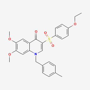 This compound is a substituted dihydroquinolin-4-one derivative characterized by a 4-ethoxybenzenesulfonyl group at position 3, 6,7-dimethoxy substituents on the quinoline ring, and a 4-methylbenzyl group at position 1. The ethoxy and methyl substituents likely modulate solubility and bioavailability, while the sulfonyl group may enhance binding affinity to hydrophobic pockets in biological targets .