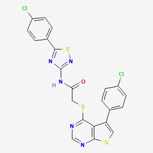 The mechanism of action of N-[5-(4-chlorophenyl)-1,2,4-thiadiazol-3-yl]-2-{[5-(4-chlorophenyl)thieno[2,3-d]pyrimidin-4-yl]sulfanyl}acetamide involves its interaction with specific molecular targets, such as enzymes or receptors. The compound’s thiadiazole and thienopyrimidine rings are believed to play a crucial role in binding to these targets, thereby modulating their activity. This modulation can lead to the inhibition of enzyme activity or alteration of signal transduction pathways, ultimately affecting cellular processes.