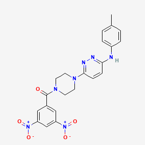 The chemical compound (3,5-dinitrophenyl)(4-(6-(p-tolylamino)pyridazin-3-yl)piperazin-1-yl)methanone represents a structurally complex molecule with significant potential in pharmaceutical research. Its architecture combines three distinct moieties: a dinitrophenyl group, a piperazine ring, and a pyridazine derivative substituted with a p-tolylamino group. This triad of functional groups confers unique electronic and steric properties, making the compound a subject of interest in medicinal chemistry.