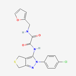 N-[2-(4-chlorophenyl)-2H,4H,6H-thieno[3,4-c]pyrazol-3-yl]-N'-[(furan-2-yl)methyl]ethanediamide is a synthetic compound that belongs to the thienopyrazole class. This compound has garnered attention for its potential biological activities, particularly in the fields of antimicrobial and anticancer research. The unique structural features of this compound, including a fused thiophene and pyrazole ring system with various substituents, contribute to its biological efficacy.