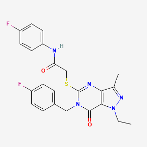 The synthesis of 2-({1-ethyl-6-[(4-fluorophenyl)methyl]-3-methyl-7-oxo-1H,6H,7H-pyrazolo[4,3-d]pyrimidin-5-yl}sulfanyl)-N-(4-fluorophenyl)acetamide typically involves multi-step organic reactions. The process begins with the preparation of the pyrazolo[4,3-d]pyrimidine core, followed by the introduction of the ethyl, fluorophenyl, and sulfanyl groups under controlled conditions. Common reagents used in these reactions include various halogenated compounds, organometallic reagents, and catalysts to facilitate the formation of the desired product.