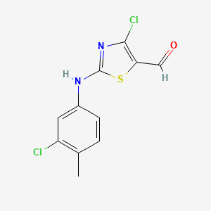 The synthesis of 4-Chloro-2-[(3-chloro-4-methylphenyl)amino]-1,3-thiazole-5-carbaldehyde typically involves the reaction of 3-chloro-4-methylaniline with 2-chloro-1,3-thiazole-5-carbaldehyde under specific conditions. The reaction is usually carried out in the presence of a base such as sodium hydroxide or potassium carbonate, and a solvent like ethanol or dimethylformamide. The reaction mixture is heated to reflux for several hours to ensure complete conversion of the starting materials to the desired product .