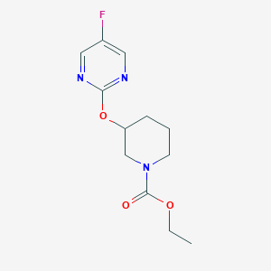 Ethyl 3-((5-fluoropyrimidin-2-yl)oxy)piperidine-1-carboxylate is a piperidine-based compound featuring an ethyl carboxylate group at position 1 and a 5-fluoropyrimidin-2-yloxy substituent at position 3. This compound is of interest in medicinal chemistry due to the pyrimidine scaffold’s prevalence in kinase inhibitors and nucleic acid analogs .